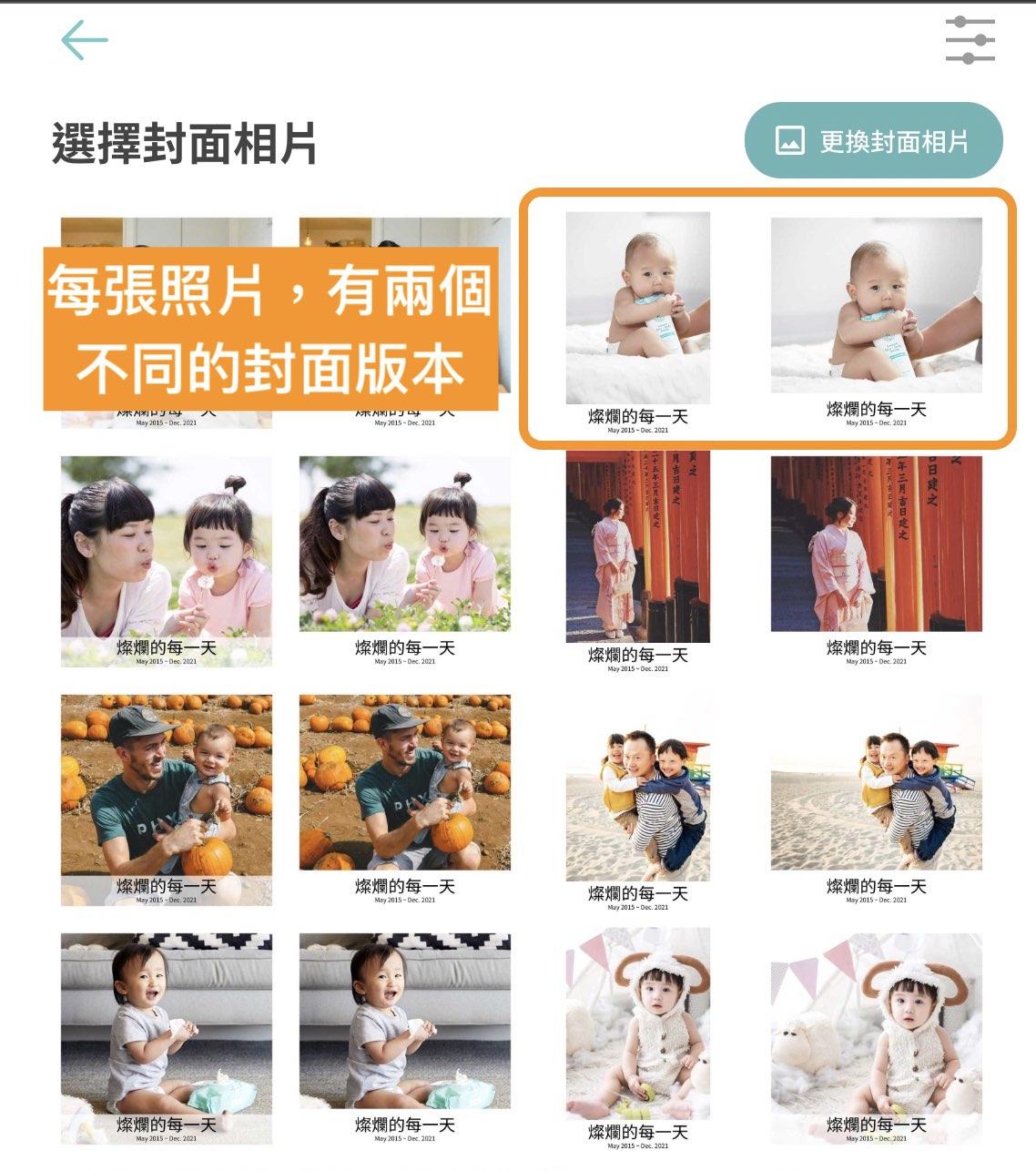 當你點擊『更換封面相片』的圖示,你就會看到如下圖二許多的封面照選項。每一張內頁照片我們都提供了兩種不同的封面照版本供你選擇,依據照片內容的不同,有時封面照是直立的照片型式,有時候是方型,有時候則是橫式的照片。你可點選你想要的封面照片後,按『更換封面相片』按鈕,封面照片就會立即更新。